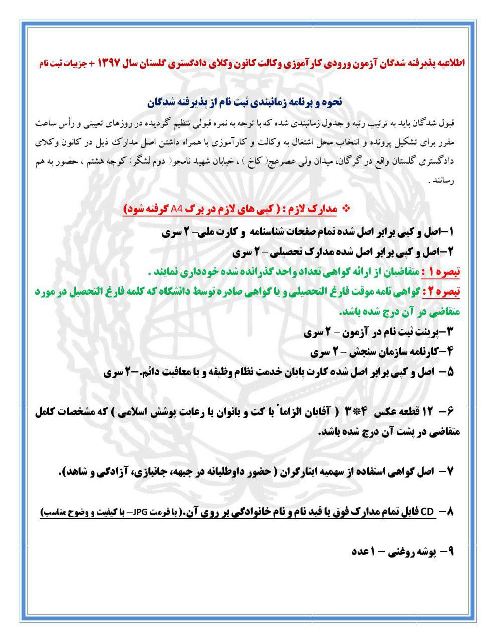 آگهی ثبت نام پذیرفته شدگان سال 97 آزمون کاراموزی وکالت کانون وکلای دادگستری گلستان