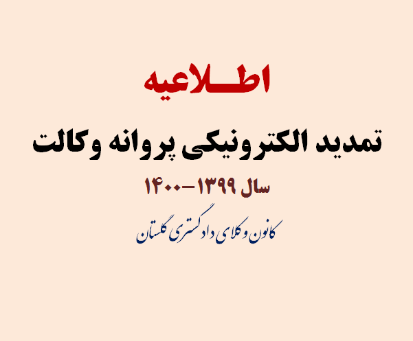 تمدید پروانه وکلا و کارآموزان محترم عضو کانون وکلای دادگستری گلستان برای سال ۱۳۹۹-۱۴۰۰ به صورت الکترونیکی انجام می شود.