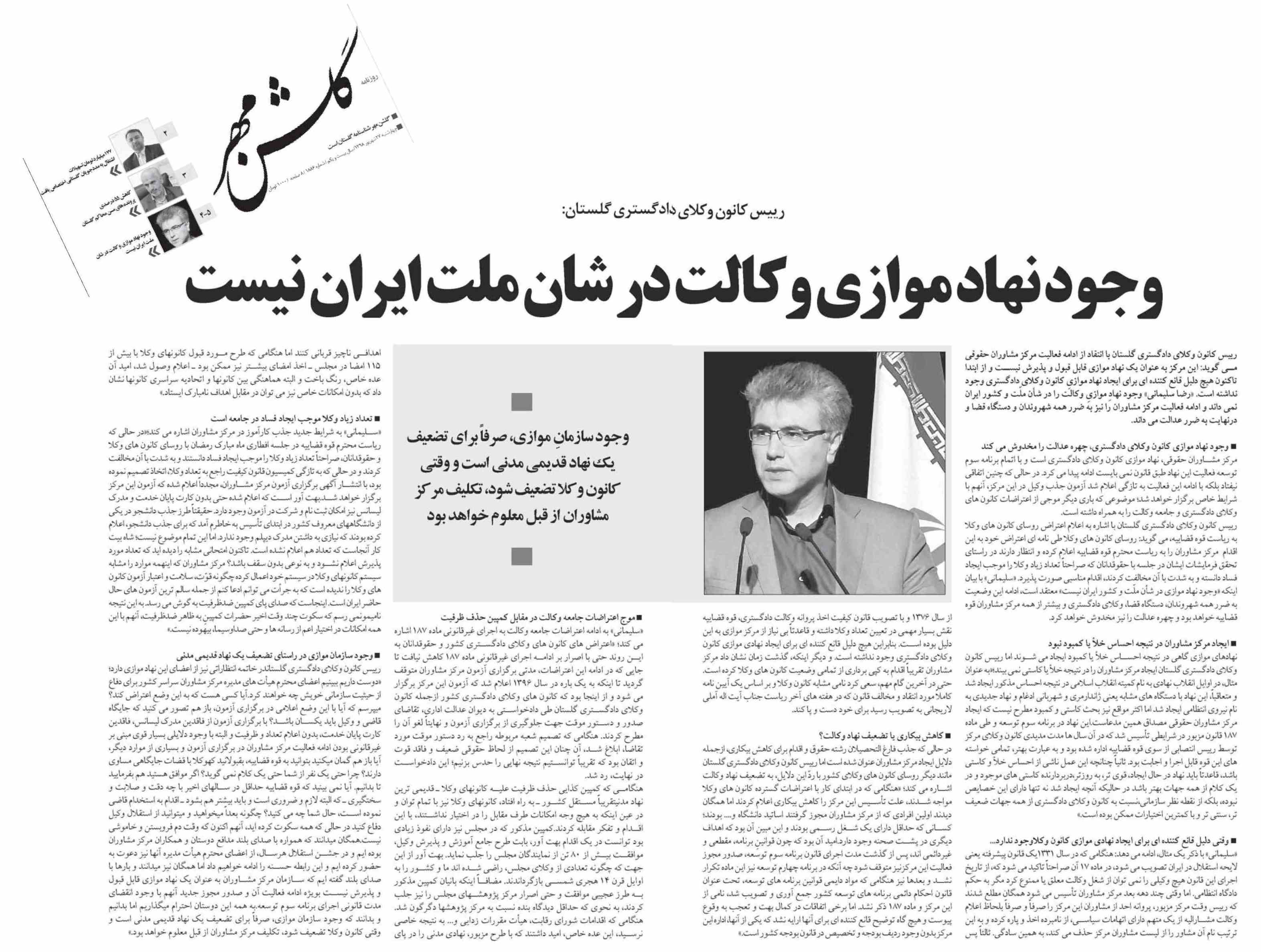 گزارش روزنامه گلشن مهر/ چهارشنبه 1398/06/27 ـ در گفت و گو با «رضا سلیمانی» رییس کانون وکلای دادگستری گلستان؛ وجودنهاد موازی وکالت، در شأن ملّت ایران نیست