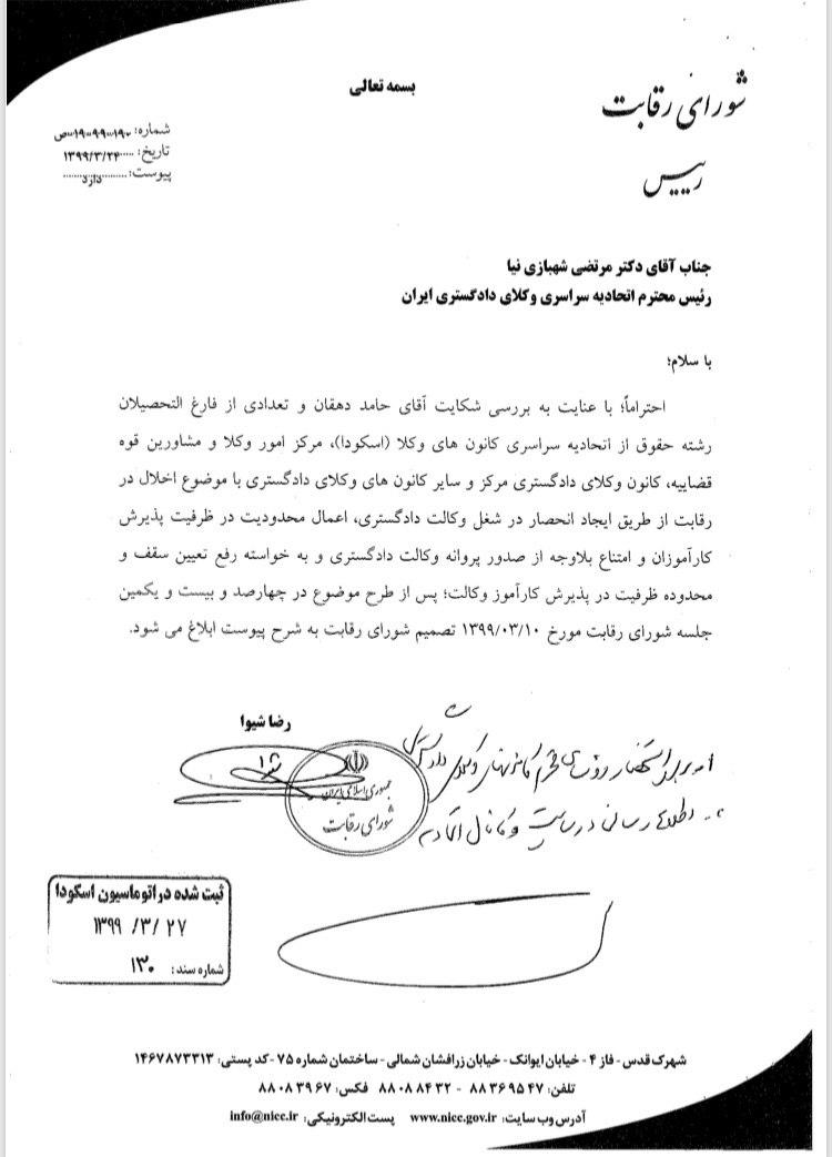 تصمیم جلسه ۴٢١ مورخ ١٣٩٩/٣/١٠ شورای رقابت در خصوص رد دعوی شاکیان علیه کانون های وکلای دادگستری، به نفع کانون های وکلای دادگستری