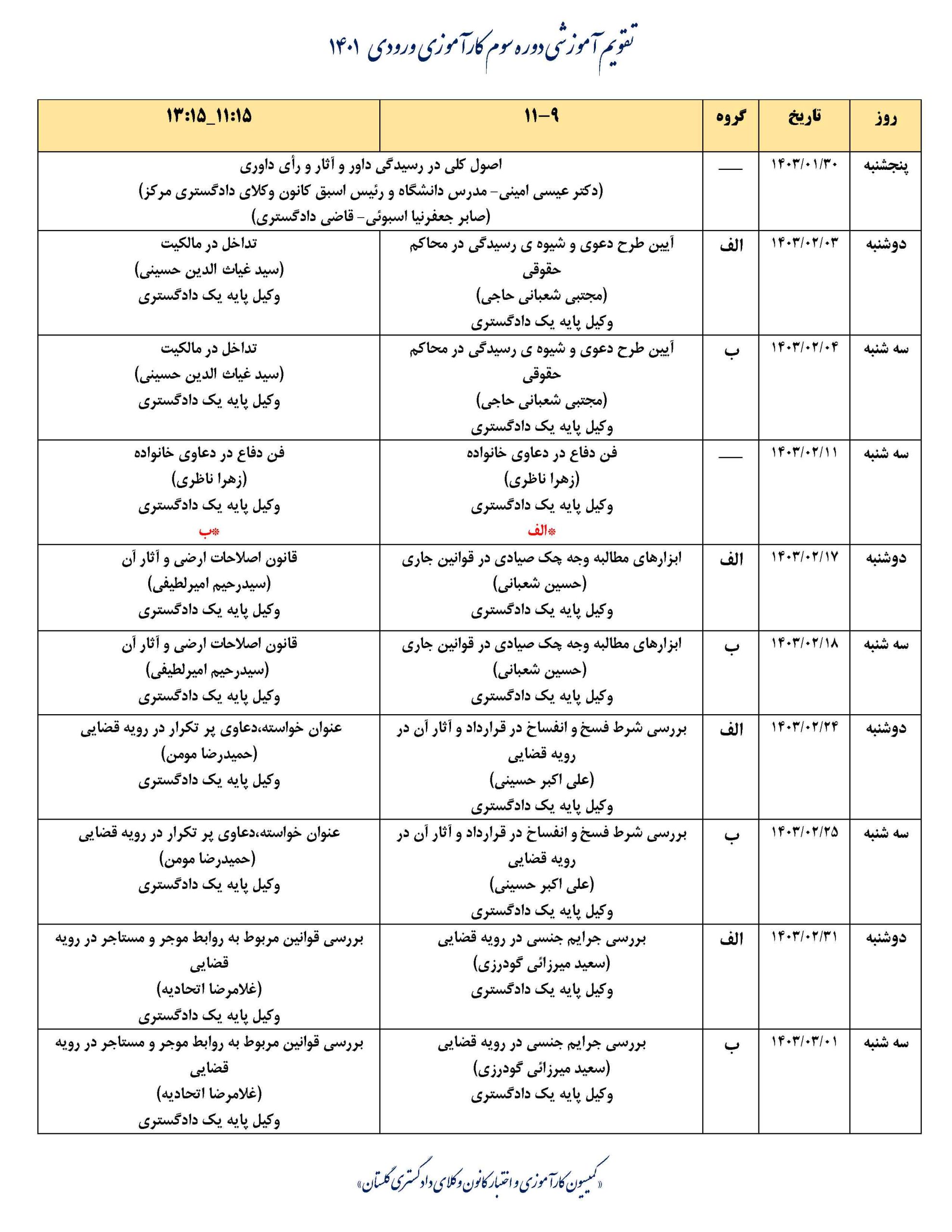 تقویم آموزشی دوره سوم کارآموزی ورودی 1401 – مکان برگزاری: سالن اجتماعات کانون وکلای دادگستری گلستان
