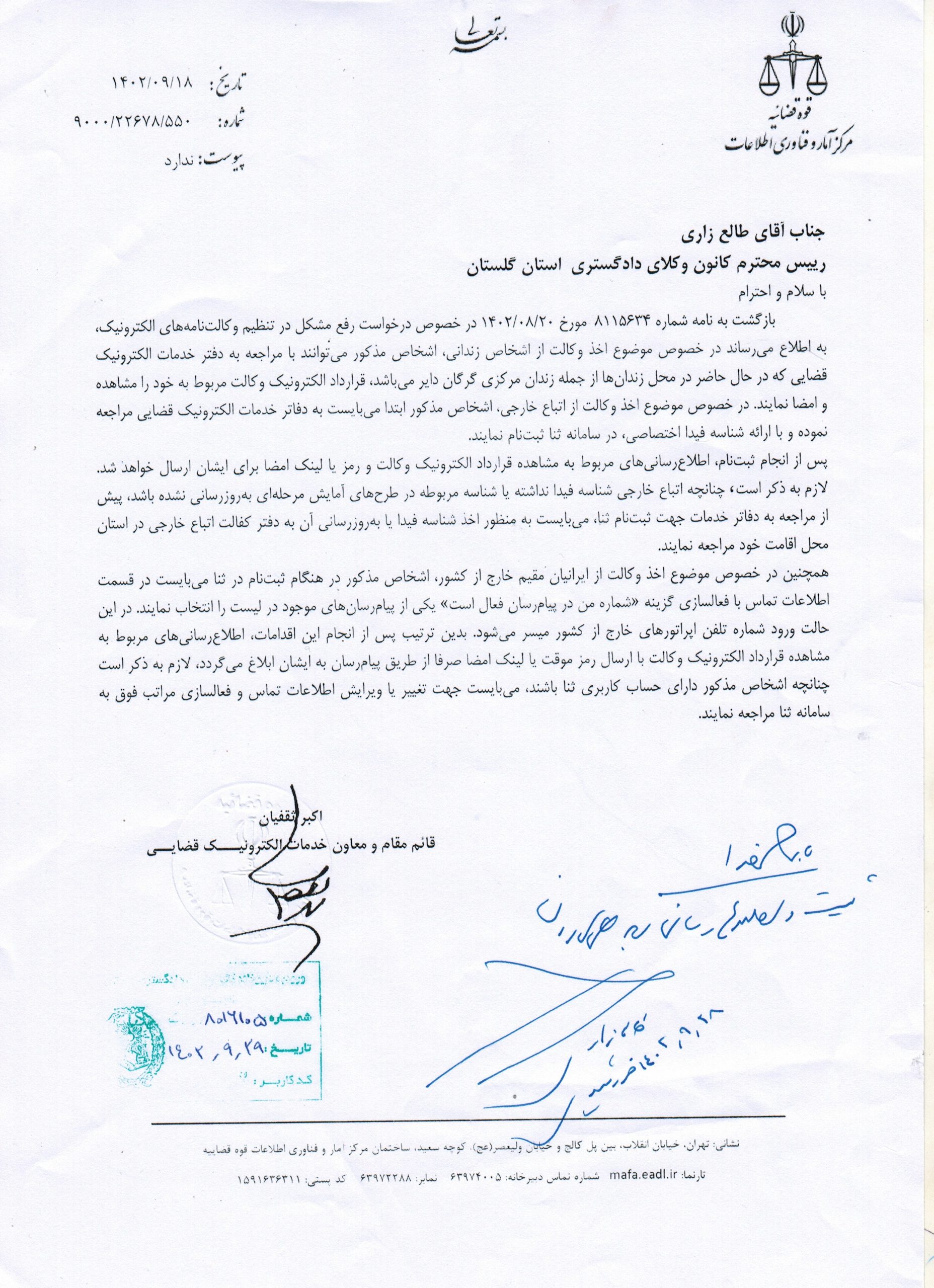 در خصوص موضوع اخذ وکالت از اشخاص زندانی، اشخاص مذکور می توانند با مراجعه به دفتر خدمات الکترونیک قضایی که در حال حاضر در محل زندان ها ازجمله زندان مرکزی گرگان دایر می باشد قرارداد الکترونیک وکالت مربوط به خود را مشاهده و امضا نمایند.