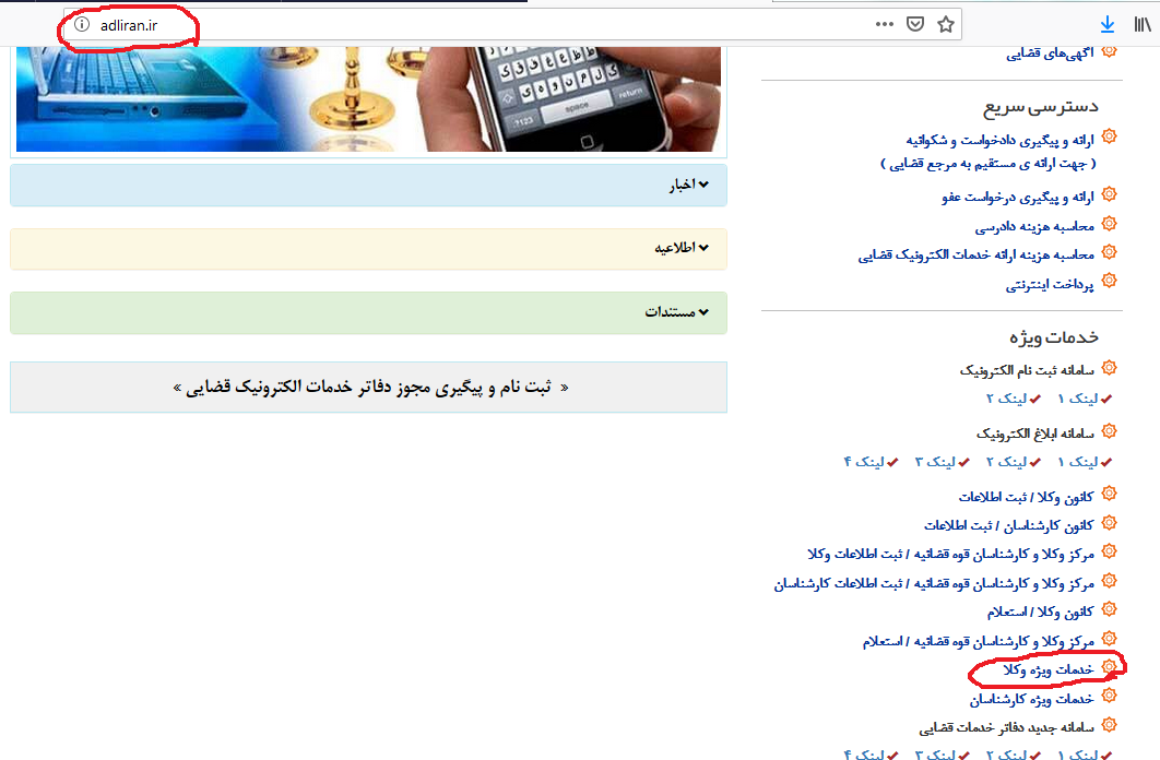 - ورود به درگاه www.adliran.ir (با استفاده از کد ملّی و رمز ثنا)