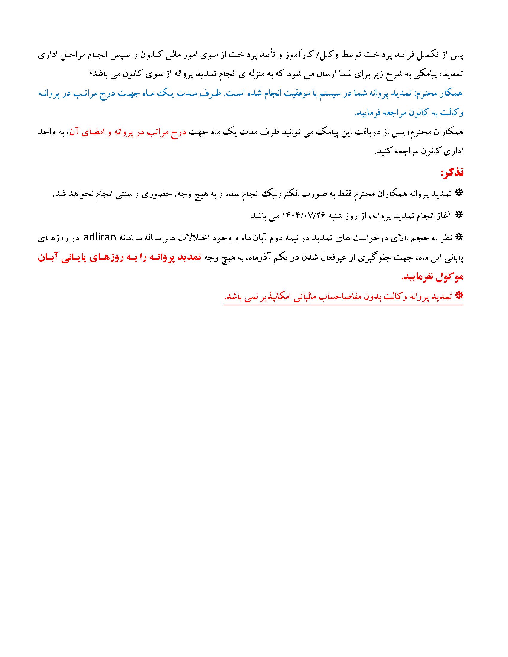 - نظر به حجم بالای درخواست های تمدید در نیمه دوم آبان ماه و وجود اختلالات هر ساله سامانه adliran در روزهای پایانی این ماه، جهت جلوگیری از غیرفعال شدن در یکم آذرماه، به هیچ وجه تمدید پروانه را به روزهای پایانی آبان موکول نفرمایید.