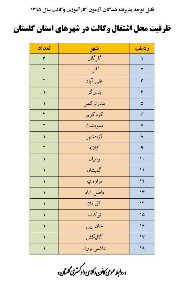 قابل توجه پذیرفته شدگان در آزمون کارآموزی وکالت سال 1395 کانون وکلای دادگستری گلستان/ ظرفیت محل اشتغال وکالت در شهرهای استان گلستان اعلام شد.