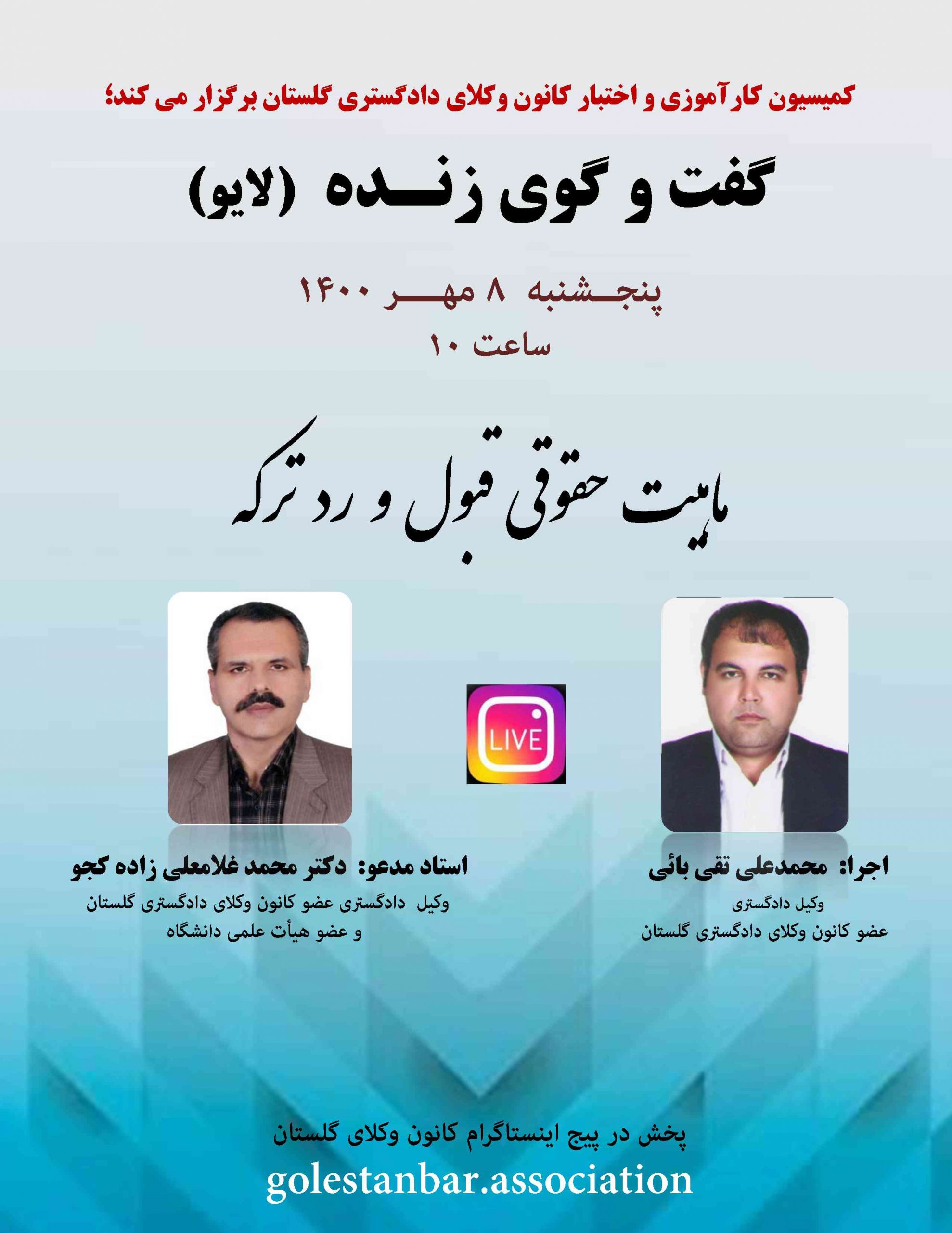 کمیسیون کارآموزی و اختبار کانون وکلای دادگستری گلستان برگزار می کند؛ گفت و گوی زنده با موضوع ماهیت حقوقی قبول و رد ترکه ـ پنجشنبه ۱۴۰۰/۰۷/۰۸ ساعت ۱۰ حضور کارآموزان محترم در این برنامه الزامی...