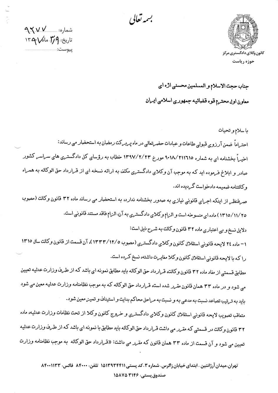 نامه رئیس کانون وکلای دادگستری مرکز به معاون اوّل قوه قضائیه و درخواست رسیدگی و لغو بخشنامه ابلاغی به روسای کل دادگستری های سراسر کشور مبنی بر تکلیف وکلا به ضمیمه نمودن نسخه ای از قرارداد حق الوکاله...