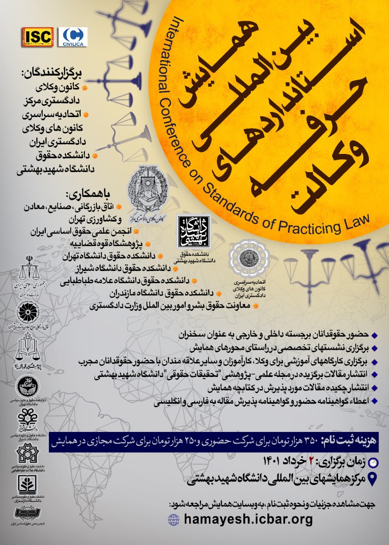 با مشارکت اتحادیه سراسری کانون های وکلای دادگستری ایران (اسکودا)، کانون وکلای دادگستری مرکز و دانشکده حقوق دانشگاه شهید بهشتی، همایش بین المللی استانداردهای حرفه وکالت، دوم خرداد ۱۴۰۱ (به صورت حضوری و مجازی) در مرکز همایش های بین المللی دانشگاه شهید بهشتی تهران برگزار می شود.