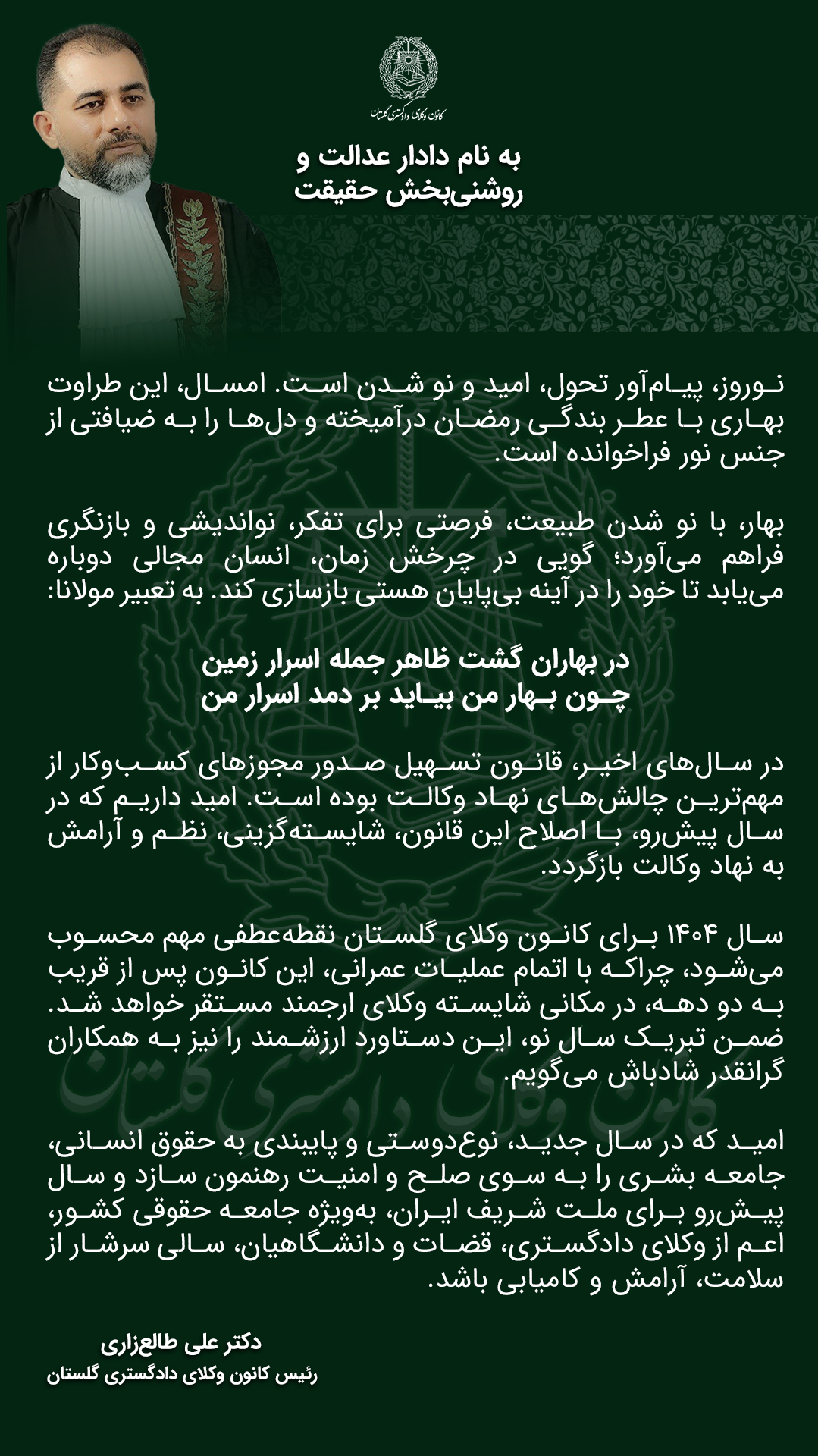 امید که در سال جدید، نوعدوستی و پایبندی به حقوق انسانی، جامعه بشری را به سوی صلح و امنیت رهنمون سازد و سال پیشرو برای ملت شریف ایران، بهویژه جامعه حقوقی کشور، اعم از وکلای دادگستری، قضات و دانشگاهیان، سالی سرشار از سلامت، آرامش و کامیابی باشد.