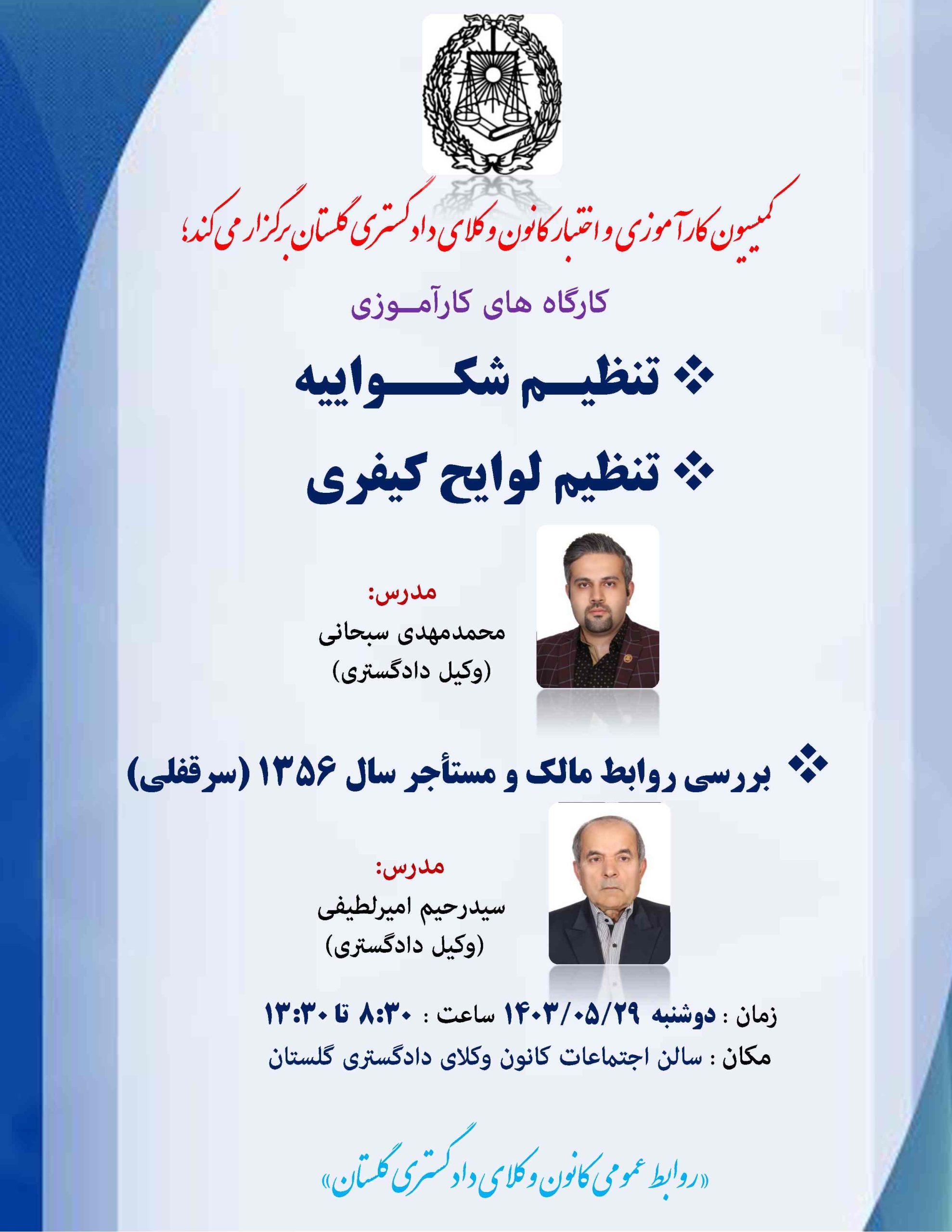 کارگاه های کارآموزی/ تنظیم شکواییه ـ تنظیم لوایح کیفری ـ بررسی روابط مالک و مستأجر سال 1356 (سرقفلی) – 29 مرداد 1403