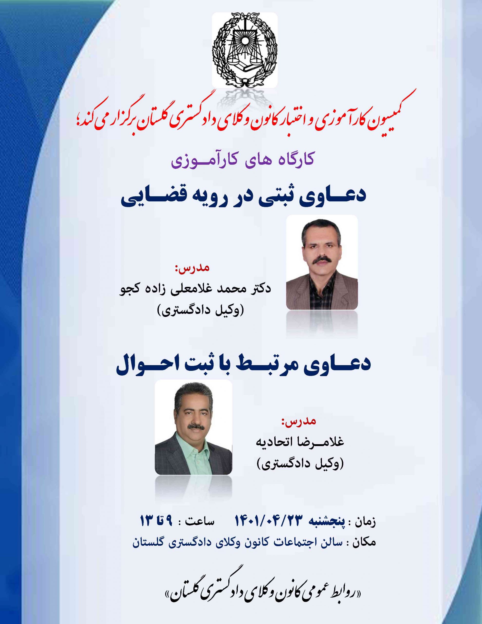 کارگاه های کارآموزی/ دعاوی ثبتی در رویه قضایی ـ دعاوی مرتبط با ثبت احوال / پنجشنبه ۱۴۰۱/۰۴/۲۳ ـ از ساعت ۹ تا ۱۳ ـ سالن اجتماعات کانون وکلای دادگستری...