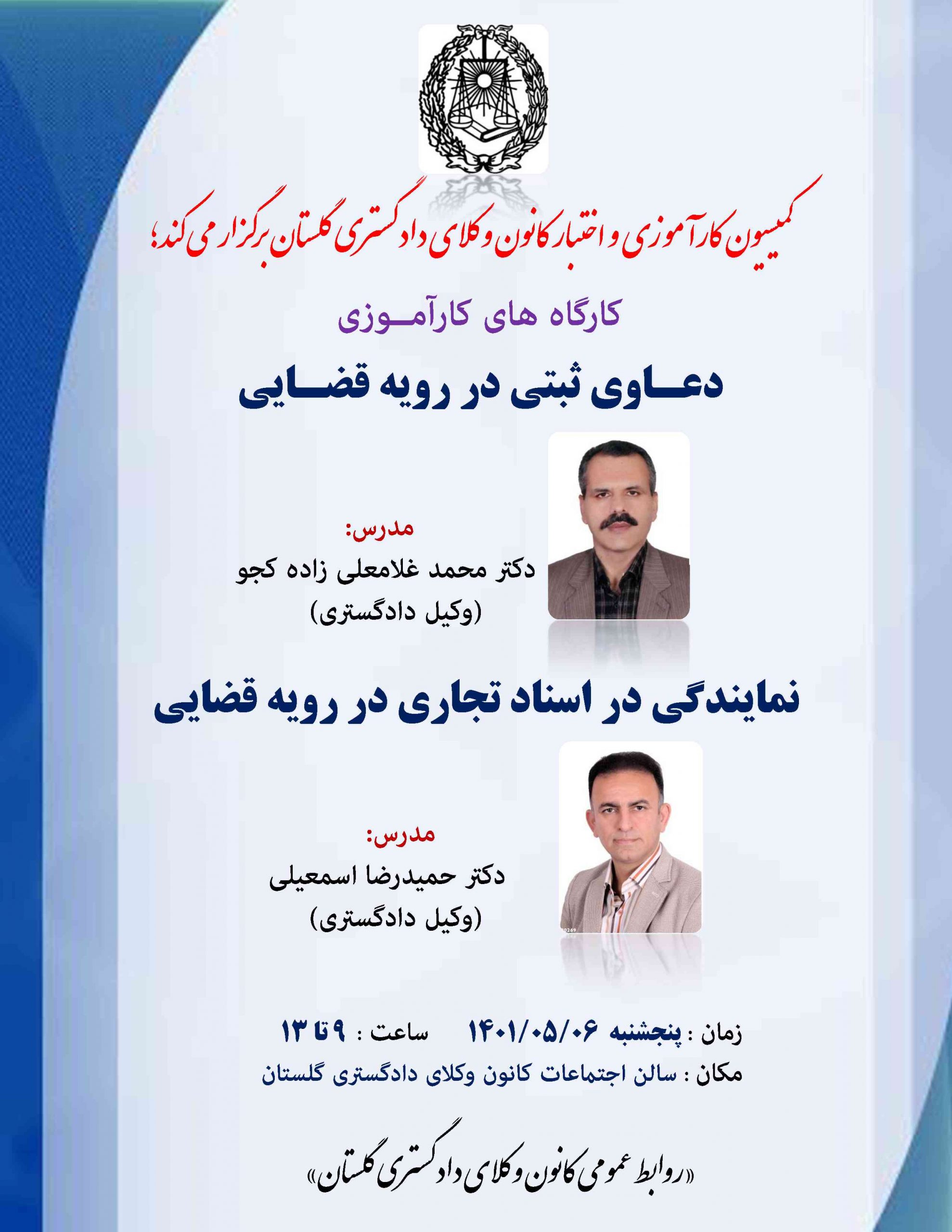 کارگاه های کارآموزی/ دعاوی ثبتی در رویه قضایی ـ نمایندگی در اسناد تجاری در رویه قضایی / پنجشنبه ۱۴۰۱/۰۵/۰۶ ـ از ساعت ۹ تا ۱۳ ـ سالن اجتماعات کانون وکلای دادگستری گلستان