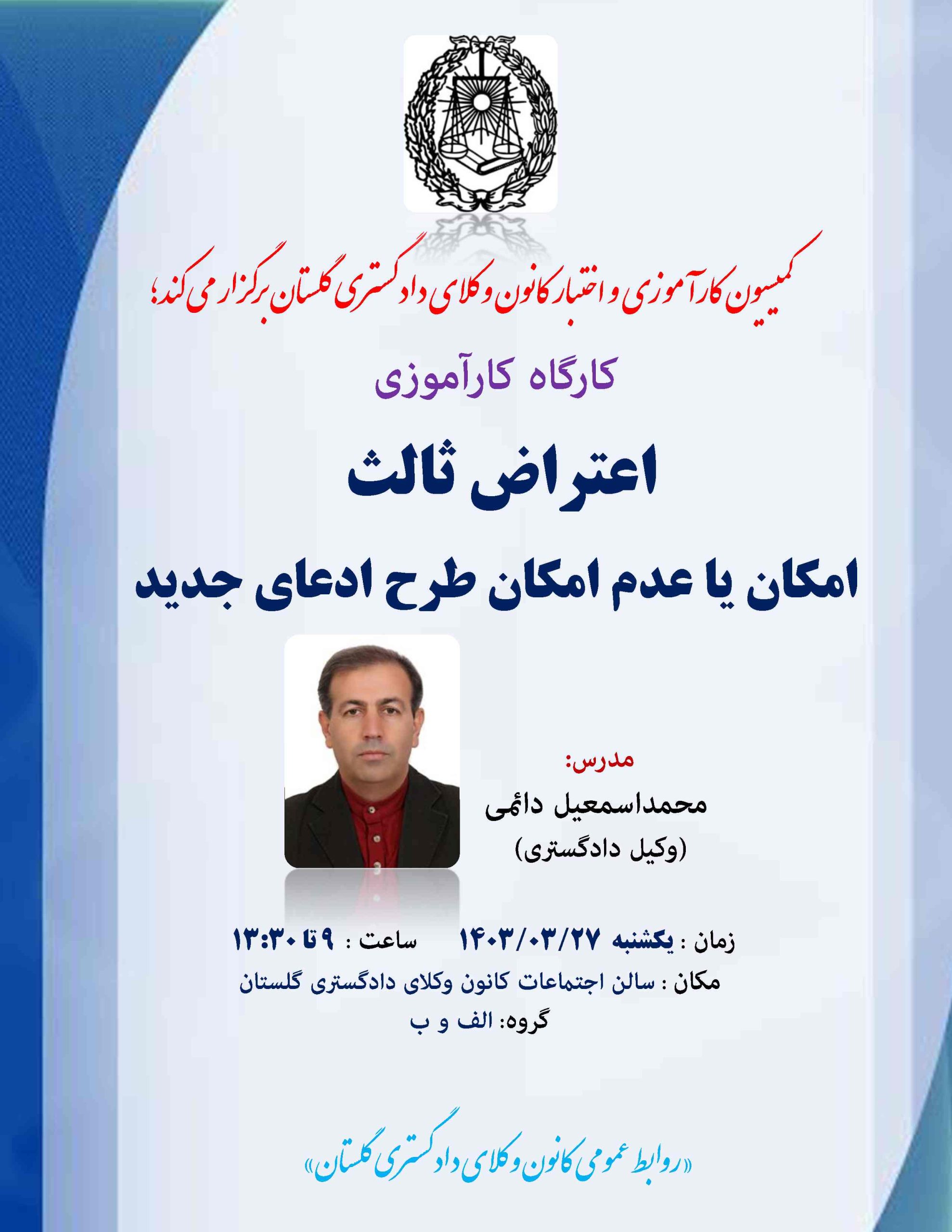 کارگاه کارآموزی/ اعترض ثالث، امکان یا عدم امکان طرح ادعای جدید – 27 خرداد 1403 ساعت ۹ تا 13:30 – سالن اجتماعات کانون وکلای دادگستری گلستان