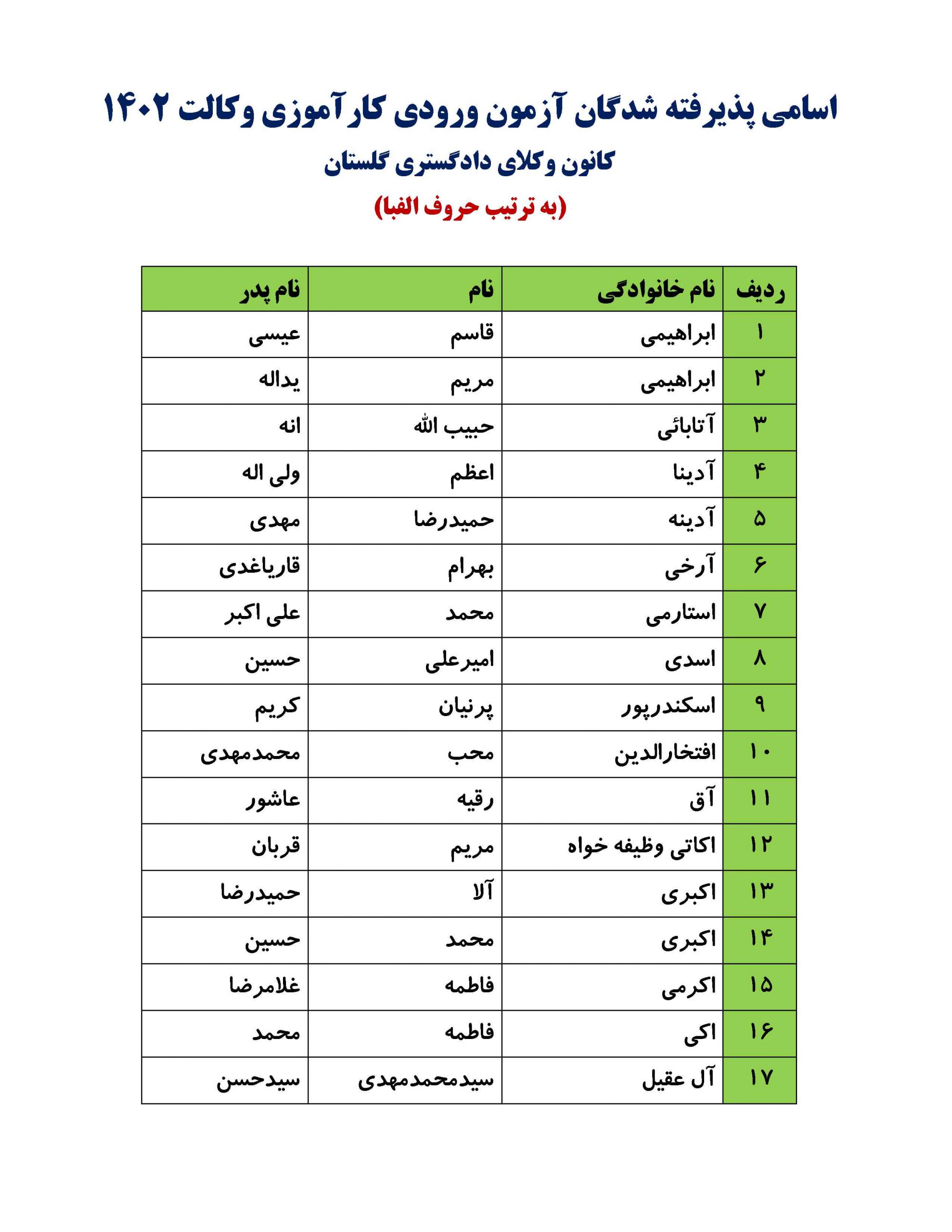 30 شهریور اسامی پذیرفته شدگان آزمون ورودی کارآموزی وکالت سال ۱۴۰۲ کانون وکلای دادگستری گلستان (به ترتیب حروف الفبا)