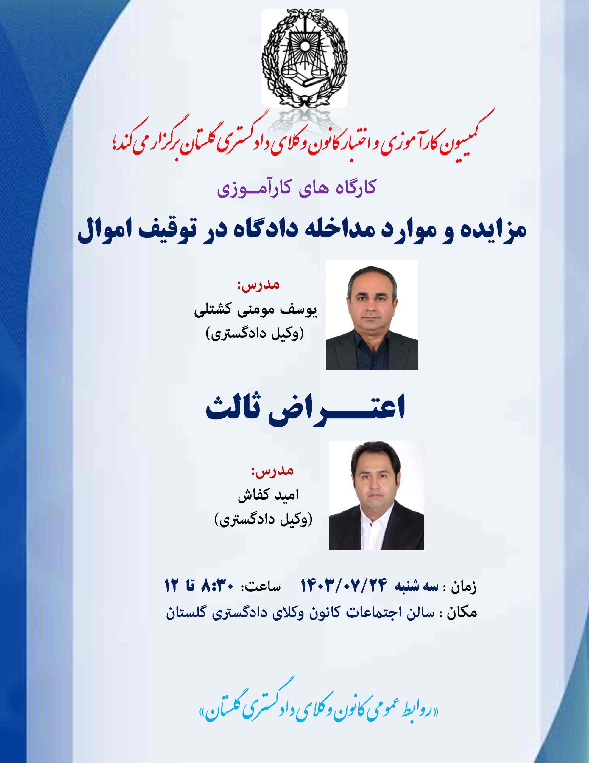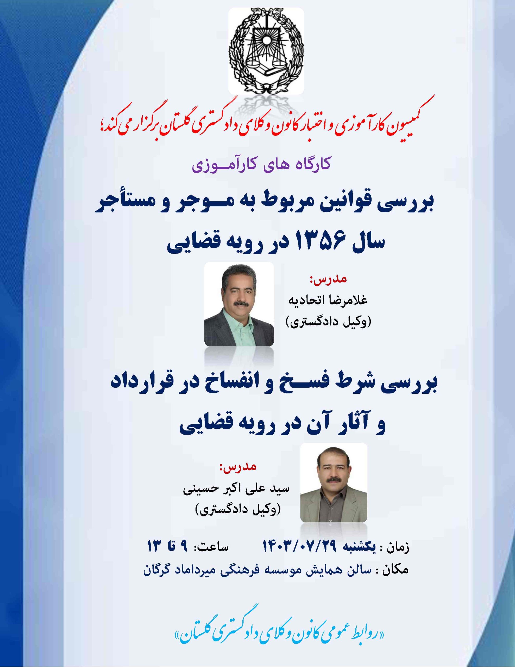 25 مهر کارگاه های کارآموزی/ بررسی قوانین مربوط به موجر و مستأجر سال 1356 در رویه قضایی ـ بررسی شرط فسخ و انفساخ در قرارداد و آثار آن در رویه قضایی – 29 مهر 1403