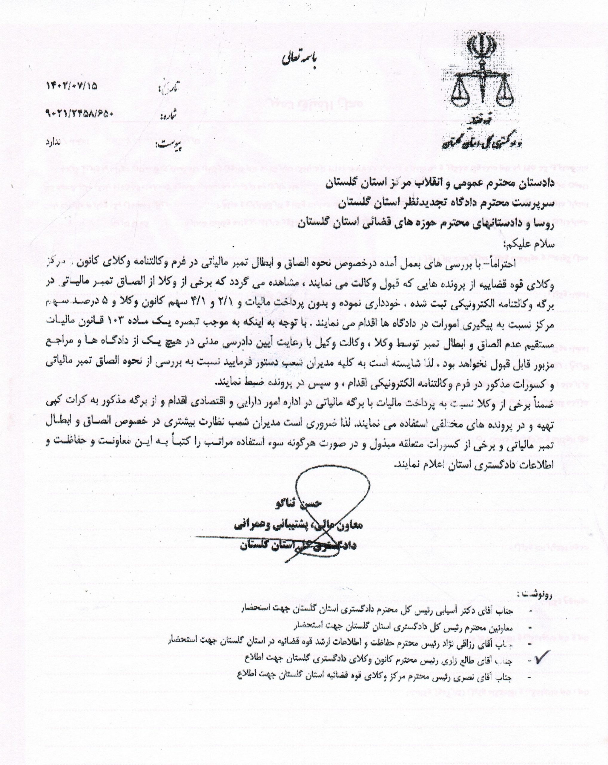 24 مهر مکاتبه معاون مالی، پشتیبانی و عمرانی دادگستری کل استان گلستان در خصوص نحوه الصاق و ابطال تمبر مالیاتی در وکالتنامه