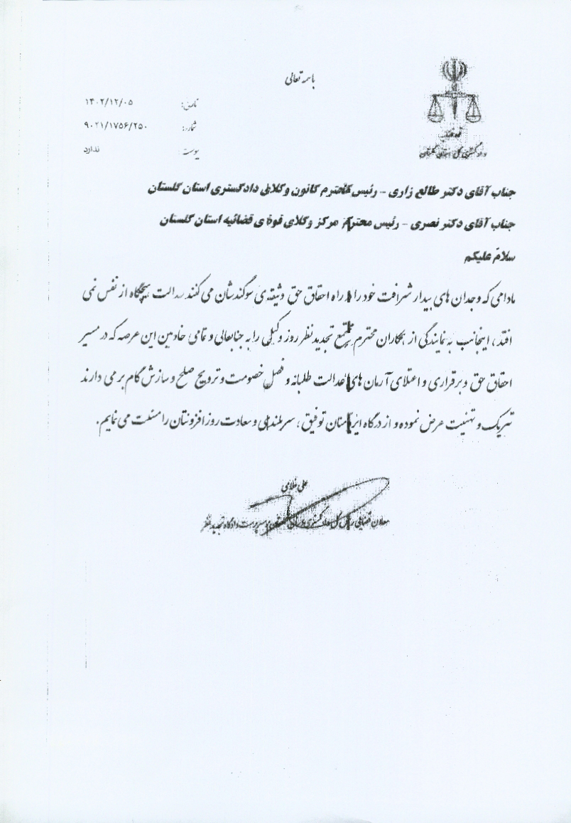 08 اسفند پیام تبریک معاون قضایی رییس کل دادگستری گلستان و سرپرست محاکم تجدیدنظر استان به مناسبت روز وکیل مدافع