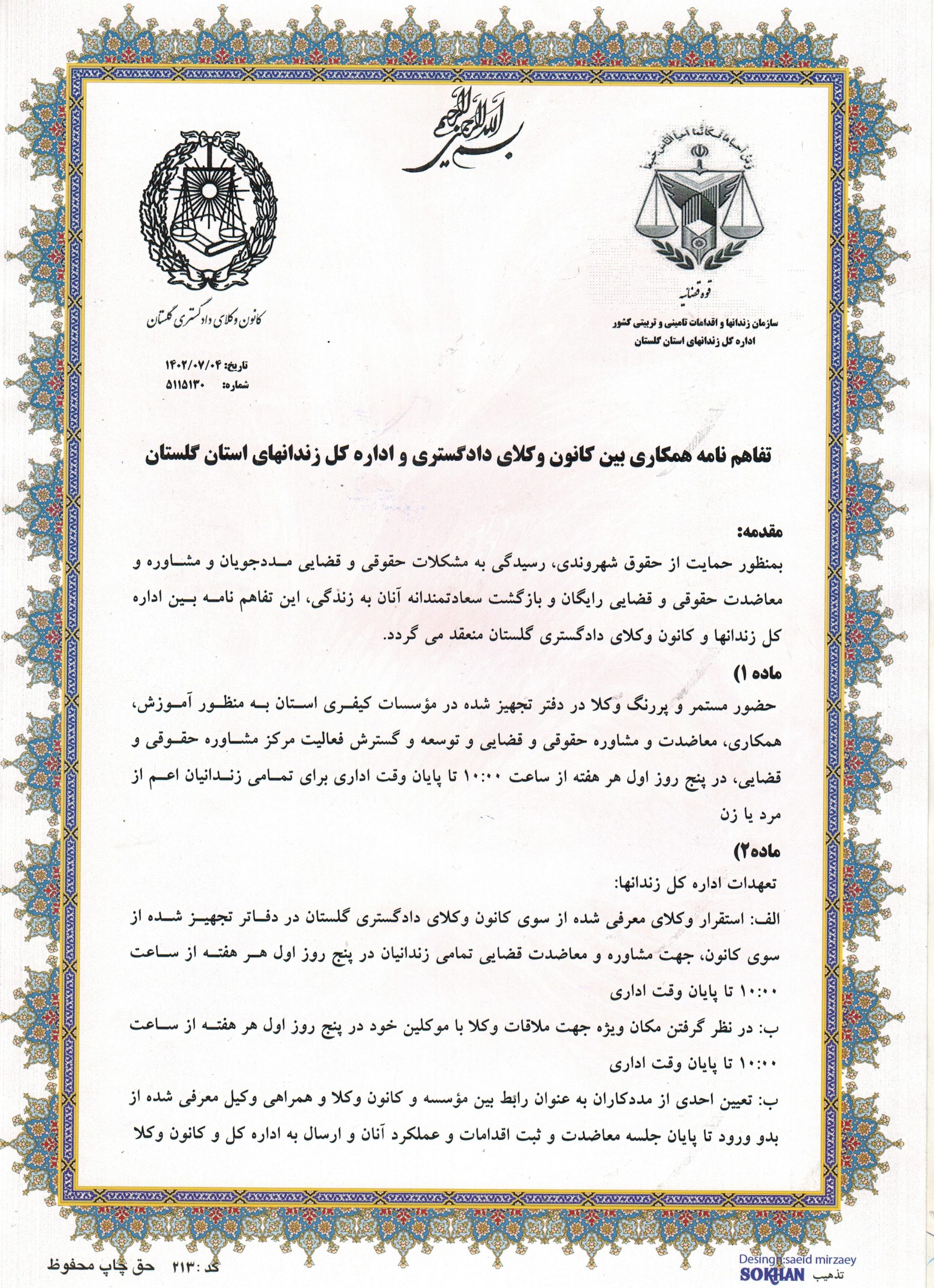 26 مهر با انعقاد تفاهم نامه بین کانون وکلای دادگستری گلستان و اداره کل زندان های استان/ زندانیان گلستان از مشاوره رایگان حقوقی وکلای دادگستری بهره مند می شوند