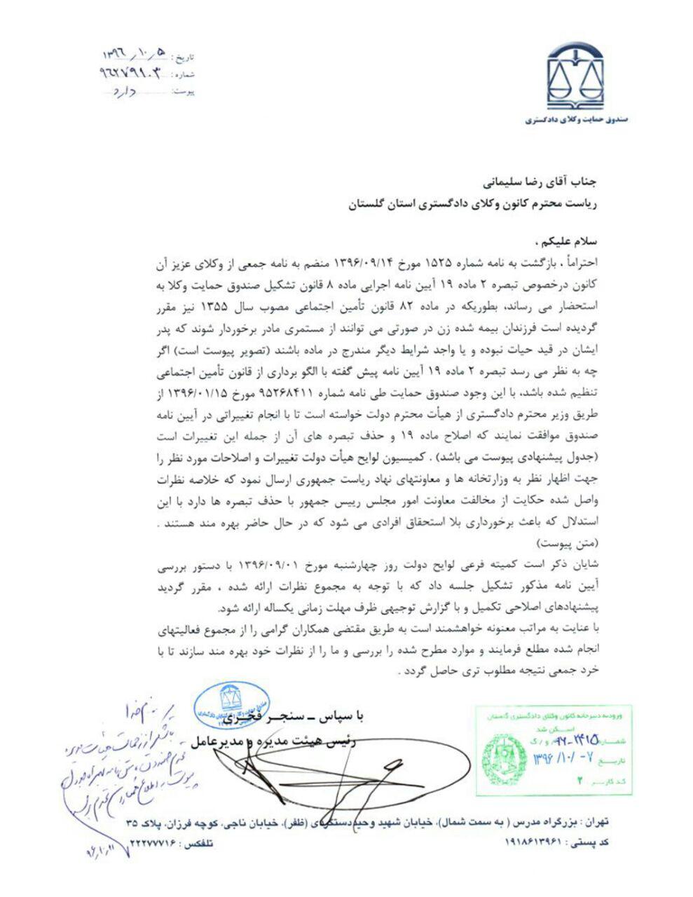 12 دی پاسخ مدیرعامل صندوق حمایت وکلای دادگستری به نامه جمعی از وکلای گلستان درخصوص تبصره 2 ماده 19 آیین نامه اجرایی ماده 8 قانون تشکیل صندوق حمایت وکلا